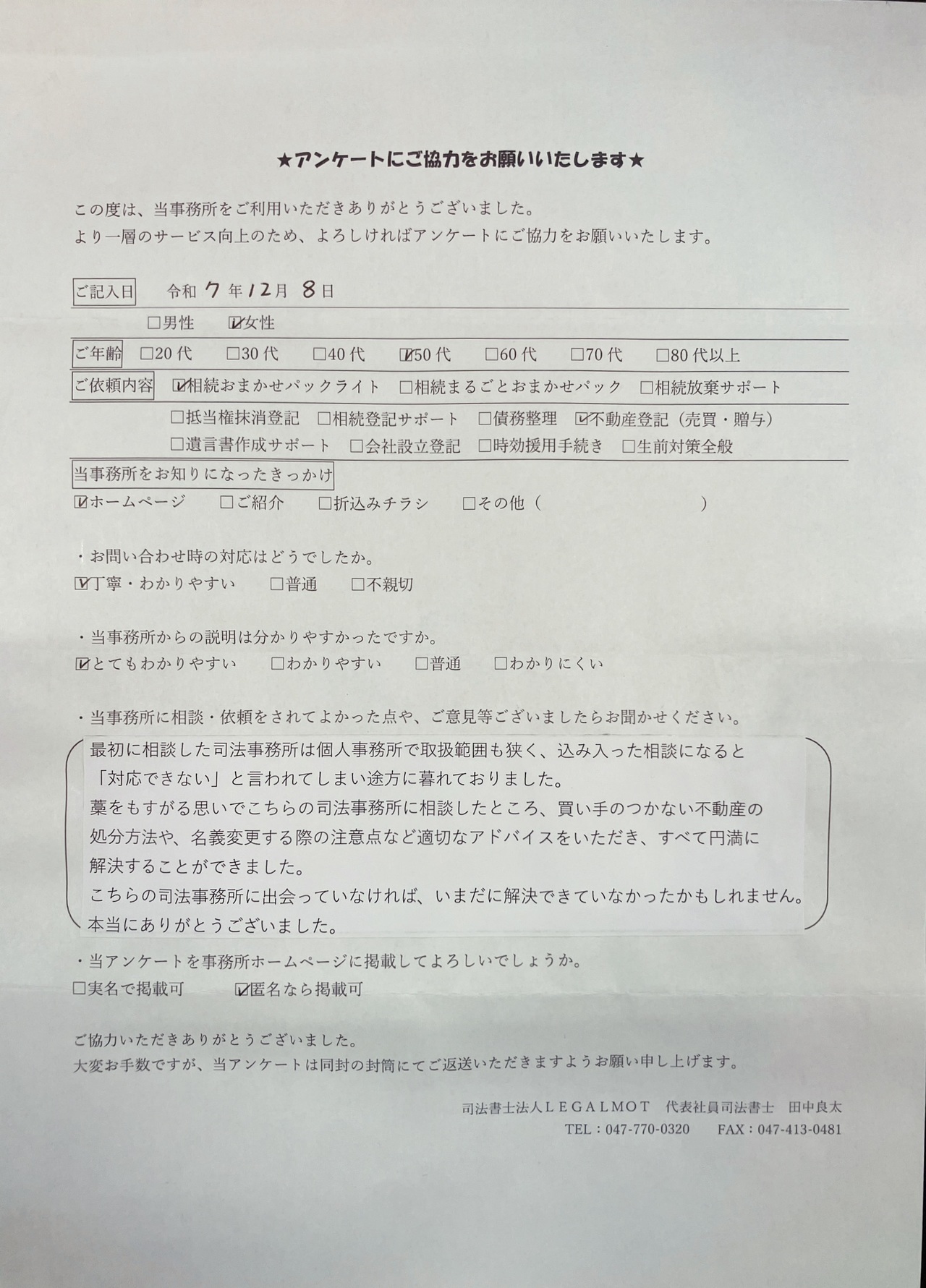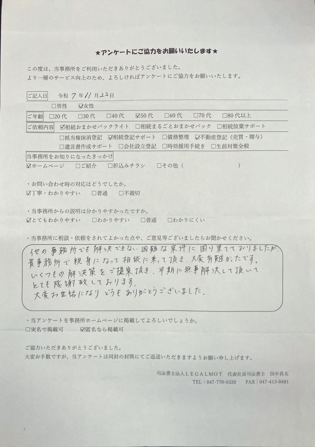 この度は、当事務所にご依頼いただき誠にありがとうございました。また、アンケートにご協力いただき、嬉しいお言葉をいただいて心より感謝いたします。ご依頼者様に安心してお任せいただけたことが、何よりも励みになります。