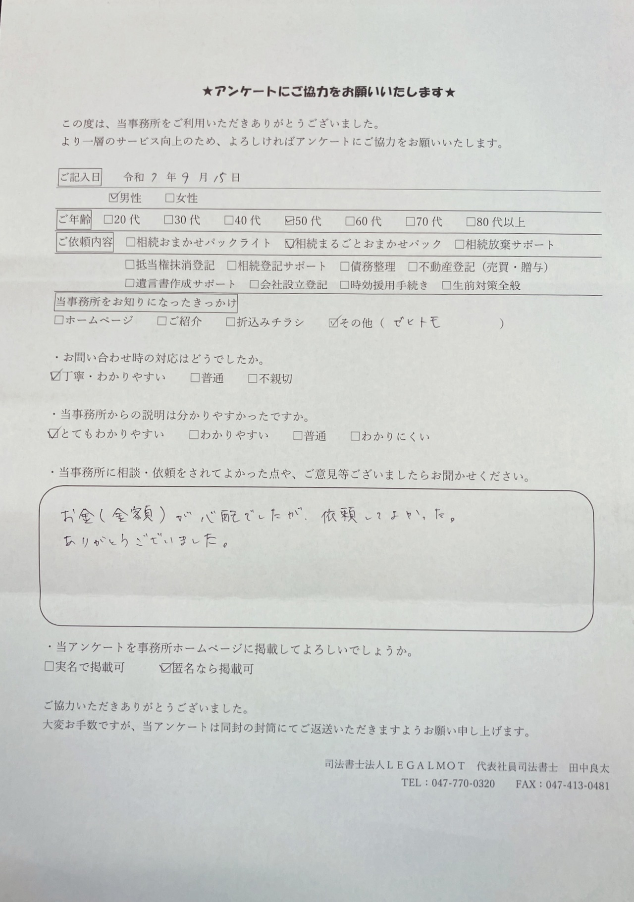 長年の懸案事項だったため、不安が大きかったのですが、丁寧に迅速に対応いただき無事手続きが済みましたことを心より感謝申し上げます。