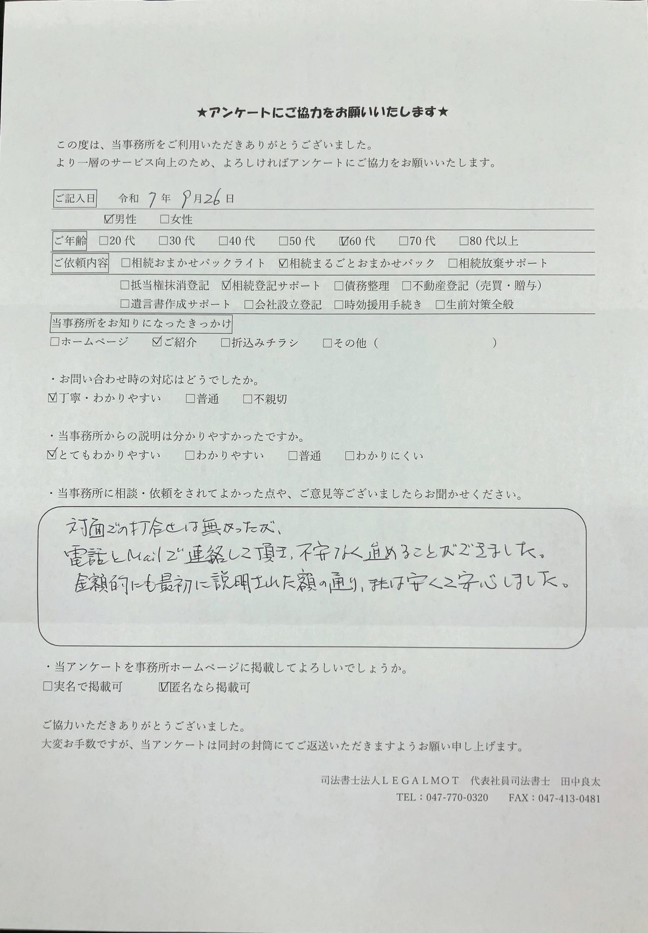 実に手際良く理解し易く、やるべき指示もいただき本当に短期間にて不動産関係、分割協議書等々も完全に終了する事ができました。